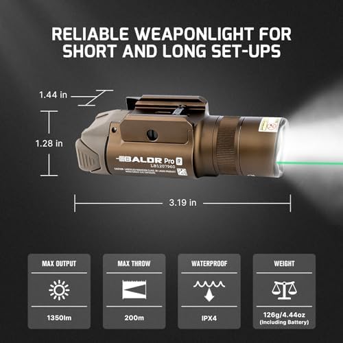 La Baldr Pro ofrece 1,350 lúmenes, un láser verde preciso y un alcance de 260 metros. Compatible con riel Picatinny y GL, es ideal para uso táctico y profesional.