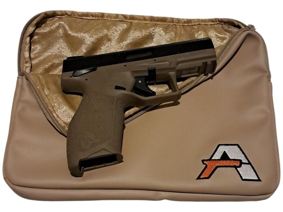 Bolsa acolchada y grande con cierre de zíper diseñada para traslado y almacenamiento temporal de pistolas y accesorios.