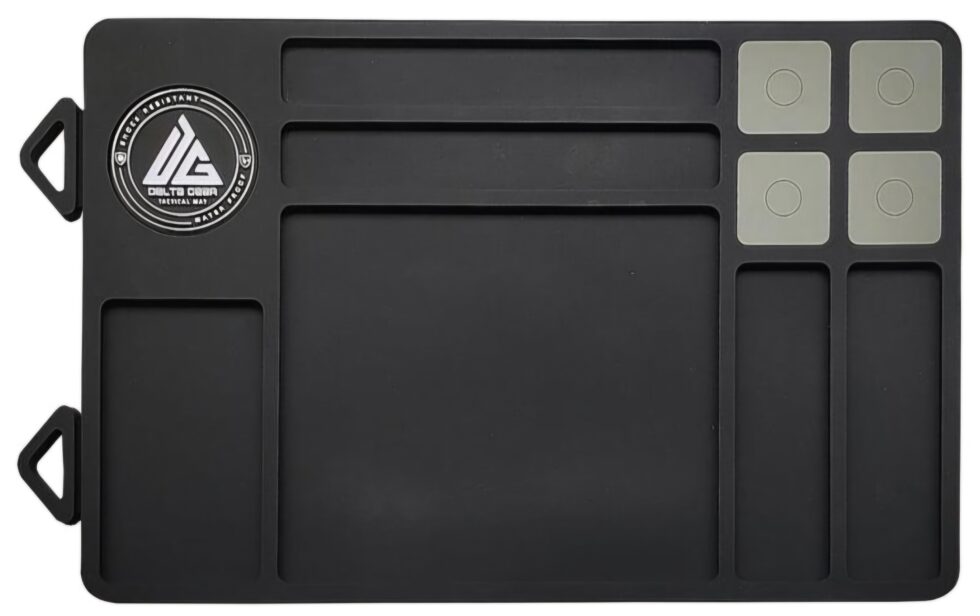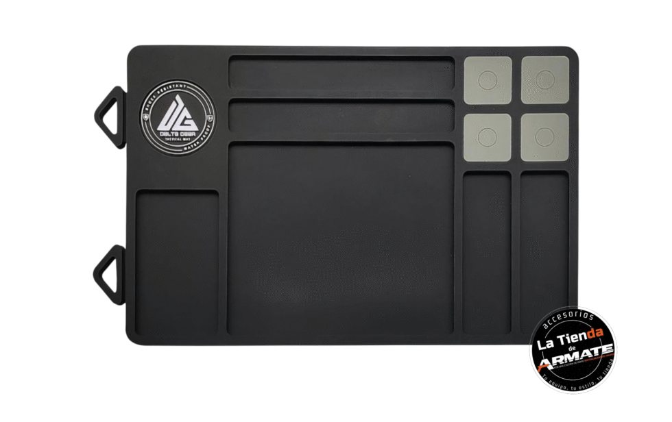 Tapete de silicón táctico para limpieza y mantenimiento de armas, con áreas magnéticas y diseño impermeable.