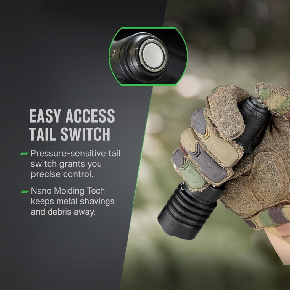 Linterna táctica de 2600 lúmenes y 630 m de alcance, con batería recargable magnética y vibración de batería baja.